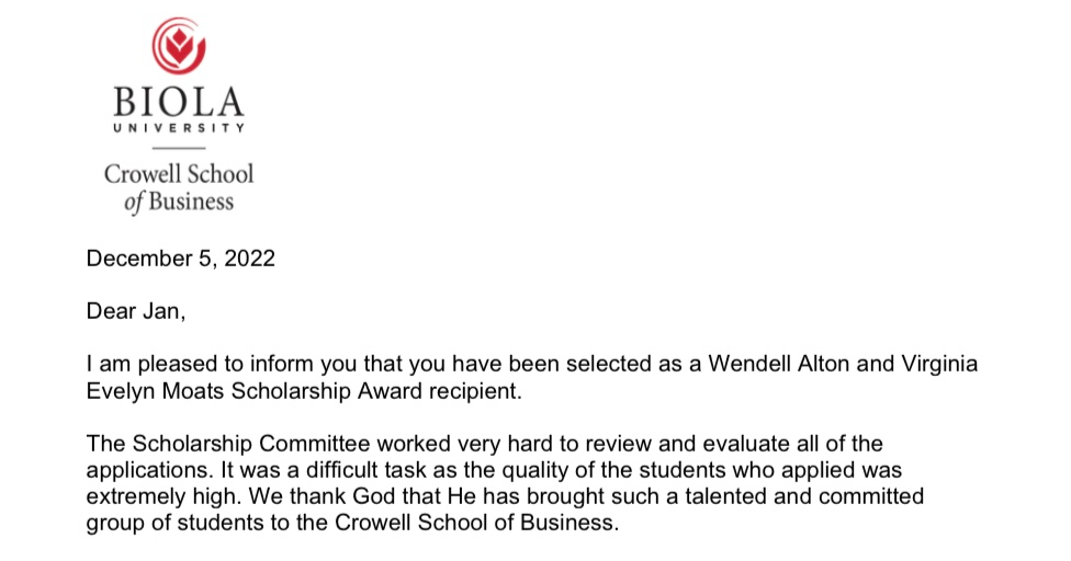 Just a month ago as well, I received news from Biola – where I’m doing graduate business school and seminary – that I have been selected for a scholarship. This not only minimizes the financial burden for me to continue school while raising little kids, but a lift to my spirit in recentering and refinding a clarity against societal norms or expectations in 2023.